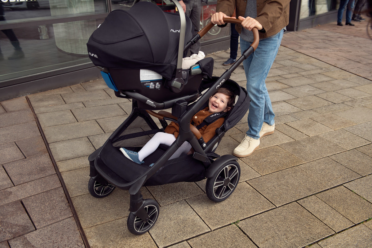 What really makes the DEMI Next a great fit for families with a baby and a toddler is its versatility from day one. You can start with a Nuna PIPA series infant car seat or full-sized bassinet for your newborn, while your older kiddo rides rides low in the Sibling Seat or hops onto the integrated rider board. Or use the all-season modular seat with a Merino wool insert and lay-flat recline for mobile newborn naps—plus UPF 50+ sun protection with a snooze-friendly canopy.